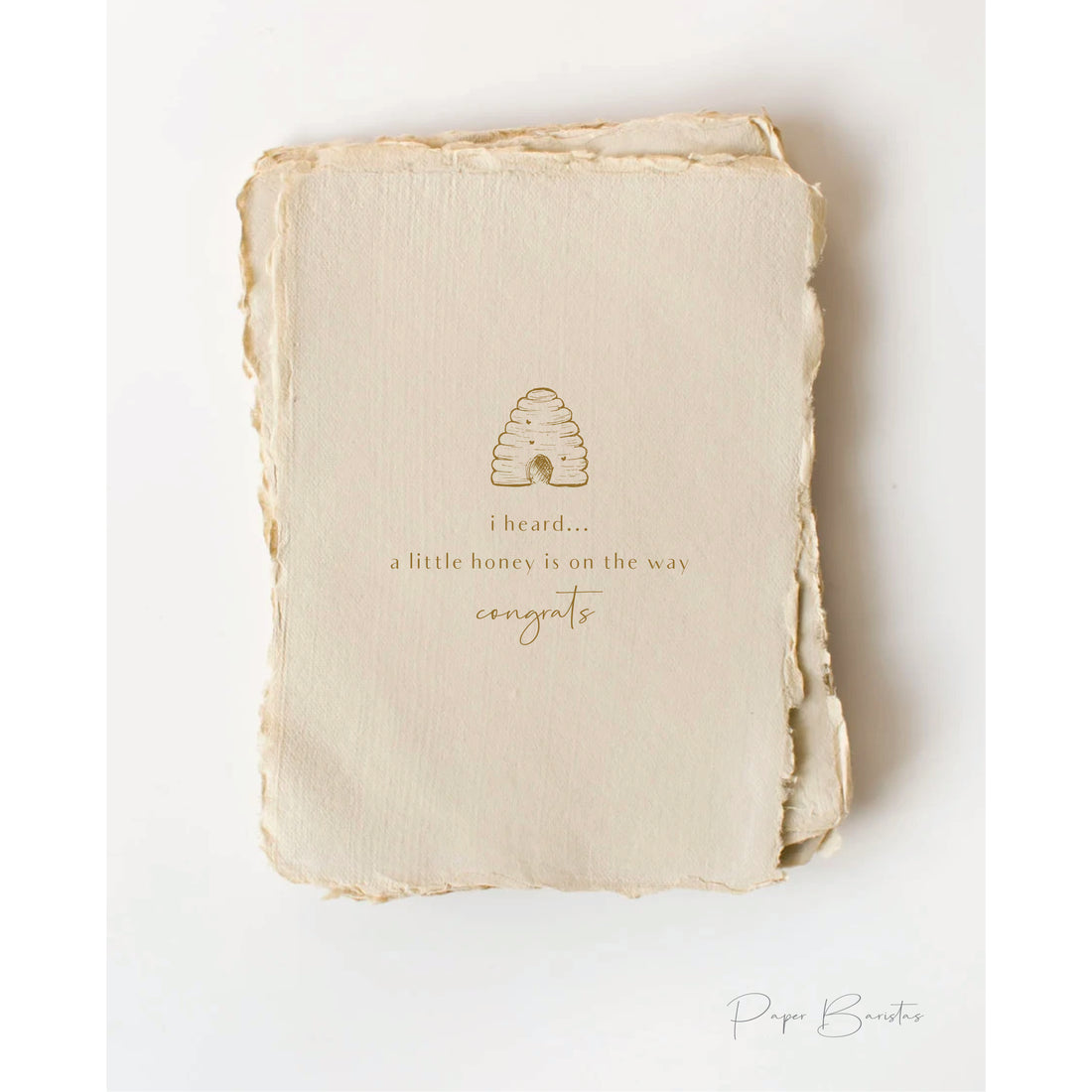 Featuring a lovely "I heard...A little honey is on the way. Congrats" message, this cream-colored card is letterpressed with antique gold ink and comes with a matching grey euro flap envelope. The one-sided card is left blank on the back, allowing you to personalize your message to the lucky parents-to-be.