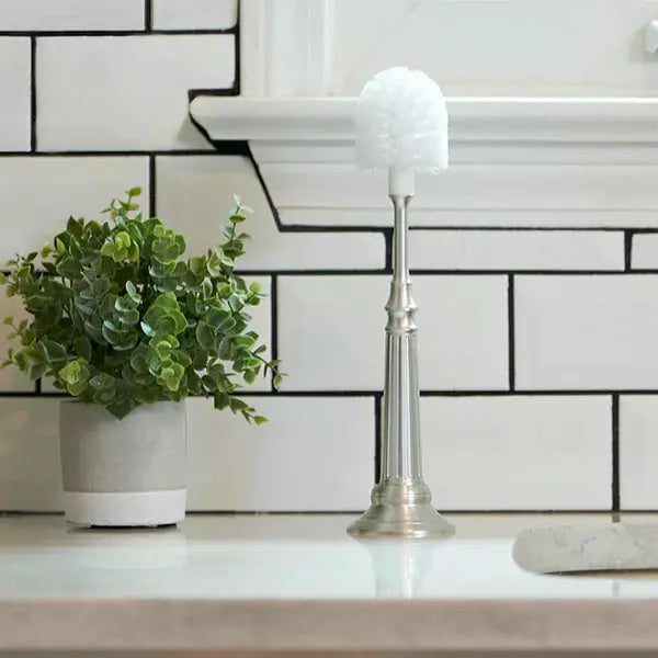 This five-piece set features a rust-proof aluminum freestanding base and weighted handle, ensuring that your brush stays upright and within easy reach. And with its versatile design, this brush is perfect for cleaning everything from baby's bottles and cups to your favorite coffee mug or wine glass. Plus, our FDA-Compliant Lab-Tested Silicone bottle nipple cleaner and two brush heads guarantee a thorough clean every time.