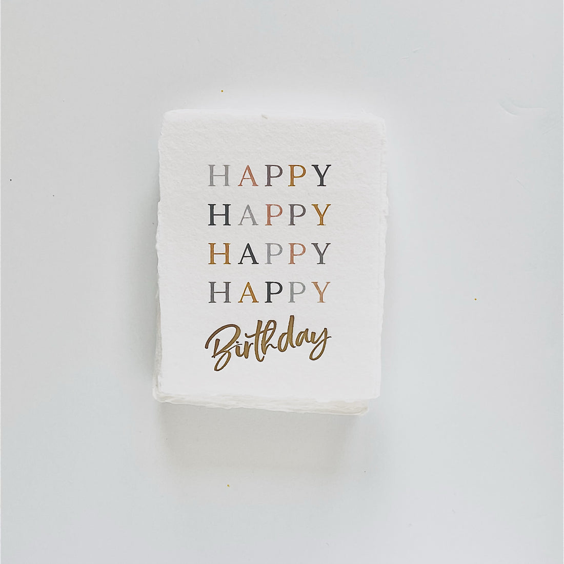 The card's stunning design features "Happy Happy Happy Happy Birthday" in elegant gold letterpress and digital ink. Measuring 4.25"W x 5.5"L, it comes with a matching gold envelope and is sleeved with recycled material. You'll love the quality and attention to detail in this one-sided card, leaving plenty of room for your personalized message on the blank back.