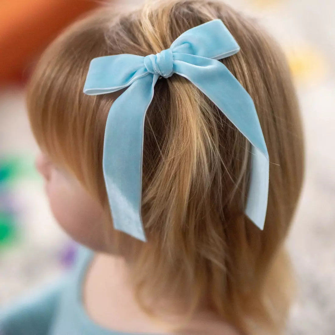 Make your little girl's day with this vintage velvet ribbon long-tail bow in a beautiful light blue color. Perfect for any occasion, from tea parties to playtime on the playground, this charming accessory is sure to turn heads.